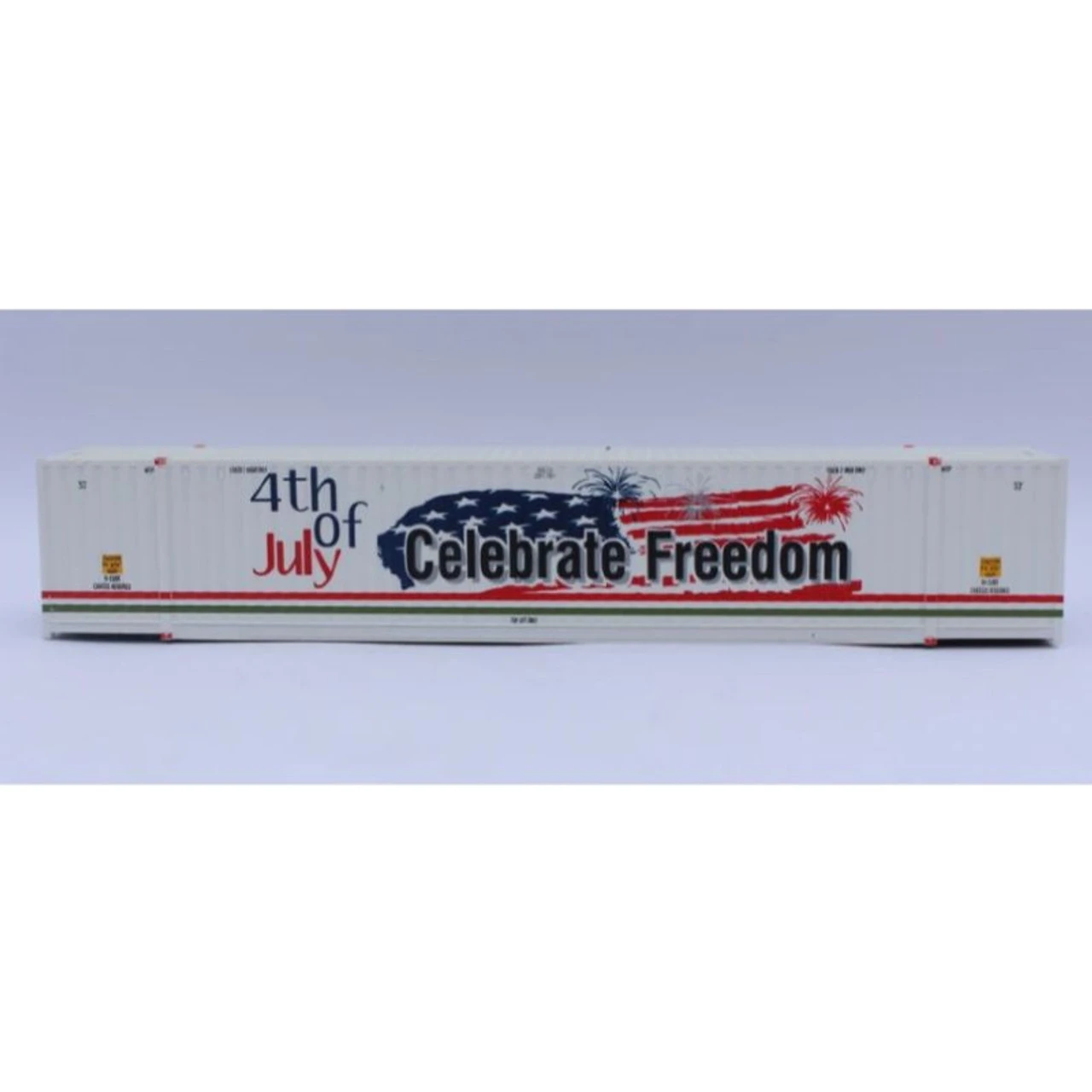 N Scale 1:160, JTC # 535093 4th of July, Celebrate Freedom, VS container. This is a Freelance 53′ container. Owner code GLIU of Greenlight Intermodal, a Freelanced Intermodal company. In Celebration of Independence Day, Greenlight Intermodal sent this container out routing across America.  THIS IS A SINGLE PACK CONTAINER. Jacksonville Terminal Co N Scale 4th of July – 53′ HIGH CUBE 6-42-6 corrugated containers with Magnetic system.