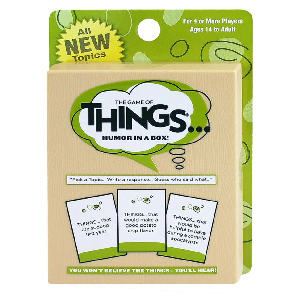 Play it on its own, or add these new topics to your larger game! In this hilarious game, you read a topic card and then write down your response. It can be anything that comes to mind, there’s no right or wrong answer! Then all the responses are read aloud and you have to figure out who said what! You won’t believe the THINGS… the people you know will come up with! Play Monster Games Game of Things Card Game Playing Time: 45 minutes Number of Players: 4-15 Suggested Age: 14+