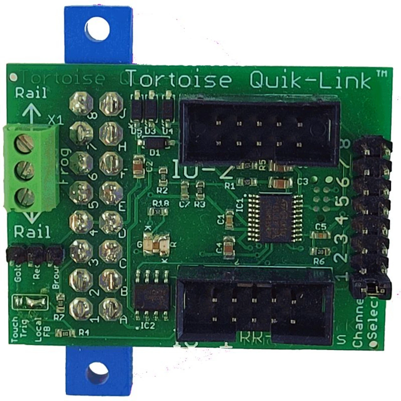 The Tortoise Quik-Link is a plug on Tortoise driver board. Breakaway connector inserts allow use on older Tortoises with narrow paddle contacts. It connects directly to any LCC output port with a standard 10 pin ribbon cable or via a QL-Breakout using a 3 wire servo style cable. It draws about 10mA of network power per Tortoise. Feedback options include Tortoise position or local Fascia panel button connection. Both control and position indication are available over the same 3 wires by using the Button Quik-Link or a Berrett Hill Touch Trigger. Manual TBA. Tortoise™ is a trademark of Circuitron.